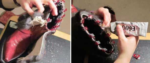 - Seguir todo el camino alrededor de la bota, pegar cada pulgada y colocar un clip sobre cada punto de pegamento.