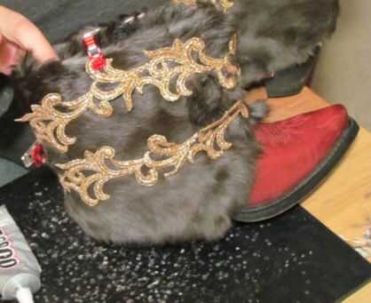 - Envuelva el corte de la mitad de la piel de conejo alrededor del eje de la bota con el borde cortado de la piel en la parte superior. (La longitud del pelaje probablemente superará la circunferencia del eje. No corte la piel extra.)