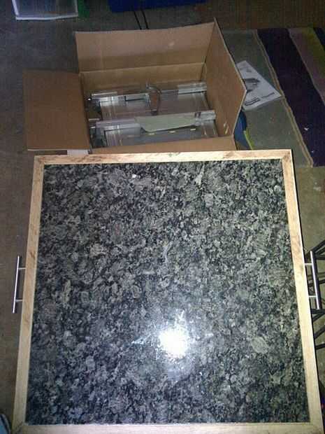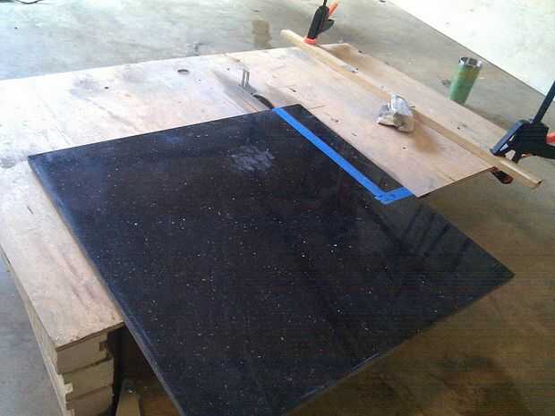 Primer problema es que los azulejos son mucho mayores que la tabla; He arreglado poniendo una pieza de madera con una ranura para el disco de diamante. Incisión la ranura con una sierra circular y sujeta la madera clavando tornillos desde la parte superior, a través de unos agujeros en la tabla de la sierra para cortar baldosa en un pedazo de madera debajo.