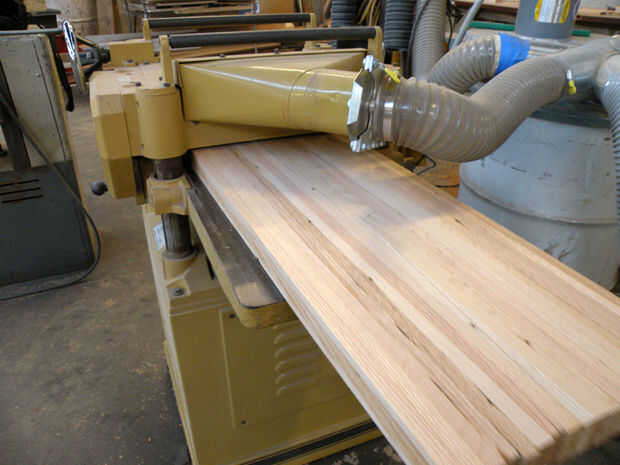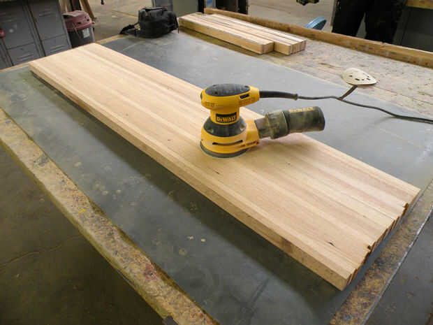 Recorren el tablero final de un cepillo, y luego arena con 80, 100 y 120 granos del papel de lija para obtener plana, lisa e incluso.  Luego, poner todo en la Sierra de picar y cortar en bloques.  Mi losa original era cerca de cinco pies de largo y un pie ancho, dejándome con cuatro tablas de cortar de tamaño decente.
