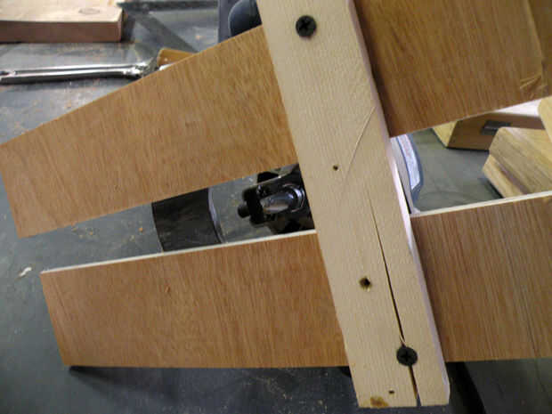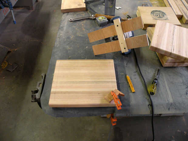 Para hacer el canal jugo alrededor del borde, hacer una plantilla sencilla para el router. Dependiendo de cómo está configurado su router, puede ser capaz de simplemente apretar y ajustar a una guía que le permite ejecutar líneas rectas paralelas al borde de la Junta. Si no, simple tornillo algunos pedazos de desecho en la placa base, como se muestra, para hacer una simple guía. Poner un poco en forma de canal y situado a aproximadamente 3/16" de profundidad. Marque una línea alrededor de los bordes de la tabla de cortar, una pulgada en cada lado. Como se muestra en el video, baja una esquina, bajan a la siguiente esquina, punta hacia arriba, gire hacia el siguiente y continuar. Final de él hacia fuera con lijado a mano.