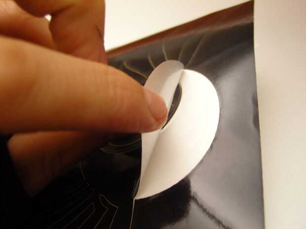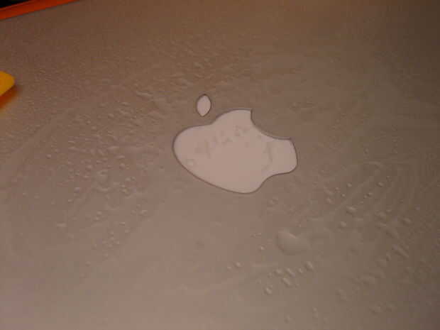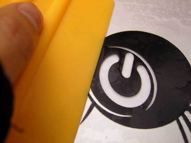 En las siguientes imágenes, verás lo que hice: un spritz de agua en el lado adhesivo de la etiqueta pelada apagado y spritz de agua en la tapa del portátil. Luego, cuidadosamente puesto abajo la etiqueta cerca de su posición final. Con el agua de allí, sin embargo, tuve tiempo de ajustar su ubicación y expulsar las burbujas de aire.