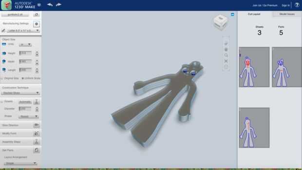 Entonces tardarás 123d donde tarda la descarga y pone que en este programa así que usted puede entonces laser corte. en el lado izquierdo de la pantalla hay una pestaña llamada "técnica de construcción" y clic en elegir láminas apiladas.