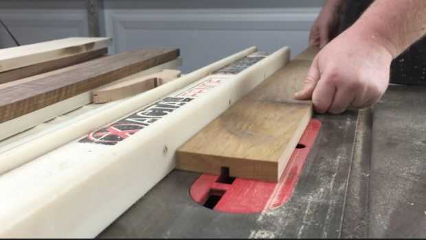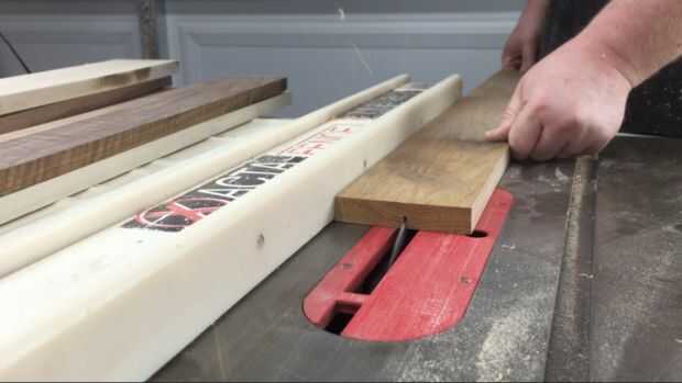 Encienda la sierra, hacer su primer corte, voltear el tablero 180 grados para que el borde que montaba previamente contra la valla ahora está hacia fuera y hacer otro paso a través de la hoja. Una vez que has hecho estos dos cortes voltee la tabla y revise los dos cortes para ver hasta qué punto aparte son.