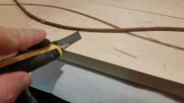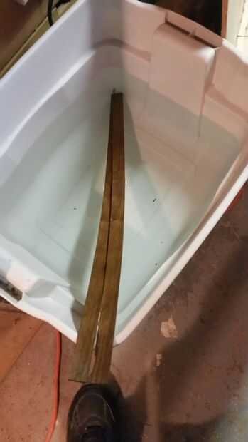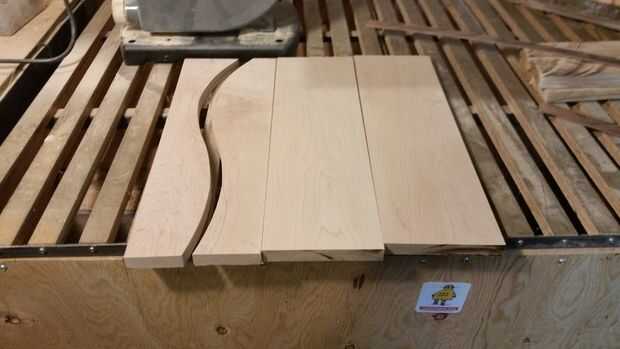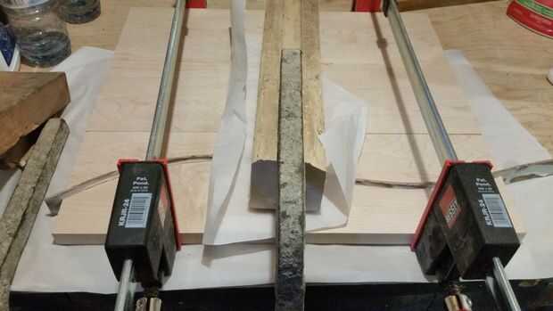 Corté 3 piezas de arce 18 1/4" 2-1/8" largo y arrancó tiras de madera de nogal. Antes de que pegan el arce, corté una curva de 1 pieza en mi sierra. Yo había empapado el nogal en el agua durante un minuto o 2 luego pega y sujeta las planchas junto con franja de 1 nuez. Una vez el conjunto de cola, corté otra curva atravesando la primera y pegado en la franja de secont nogal. Después el pegamento otra vez, he utilizado un cuchillo para recortar algunos de la tira de exceso de