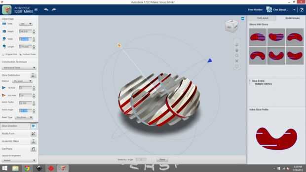 Observe que el panel de la derecha muestra el material y todas las rodajas que el programa está generando. A veces algunos de sus sectores se vuelve rojos. Esto significa que hay errores con esas rebanadas y necesita asegurarse que serán bien o volver y cambiar la configuración para eliminar errores. También manualmente puede colocar rodajas para asegurarse de que capturar ciertas características de su modelo, o para eliminar errores. También hay características a modificar (espesar o remodelar) el modelo 3D para obtener mejores resultados. Jugar!