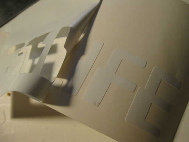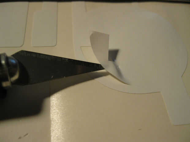Cuando se quita la parte exterior, es hora de deshacerse de cualquier bits internos. Es difícil ver dónde está la línea de corte, pero con el vinilo a la perpendicular a la luz, ayuda. Yo uso un cuchillo de la manía para pelar suavemente encima de cualquier 'huecos' en la imagen. La idea es retirar el vinilo sin jugar hasta el papel del forro así que pensar como un cirujano y una mano constante. Compruebe su trabajo contra la imagen original para obtener seguro de todo.