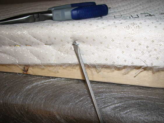 Con la cabeza plana Destornillador y alicates, retire todas las grapas de la parte inferior de la caja, a lo largo de los lados largos. No quite las grapas en los extremos cortos. Lo más probable es que la cubierta de tela en la parte inferior se une con un diferente conjunto redundante de grapas de la tela. En serio hay un montón de grapas aquí. Afortunadamente usted puede conseguir la parte más tediosa del trabajo realiza en primer lugar.