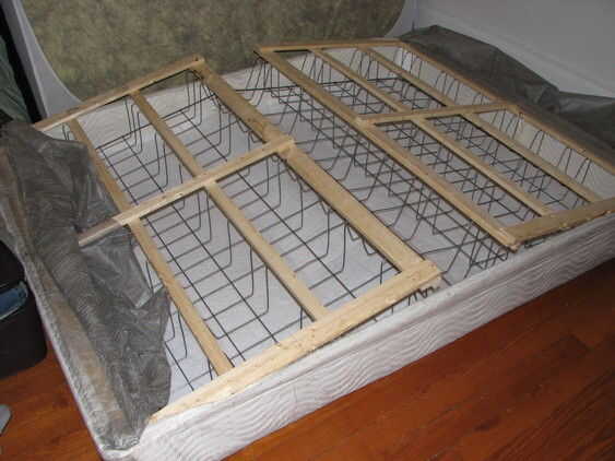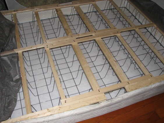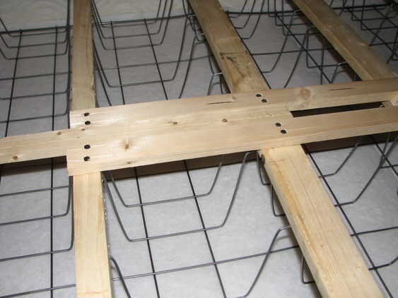 Cortar cuatro piezas de madera lo suficientemente largos para abarcar entre el mediados cuatro travesaños. Fijarlos a los travesaños con tornillos de madera, junto a los rieles de corte. Usted notará que partí la madera bastante mal, pero pongo en bastantes tornillos que se sentía seguro. No pude encontrar mis pedacitos de taladro en el caos de la mudanza, pero yo debo has pasado un poco tiempo más. Siempre haga sus agujeros, niños!