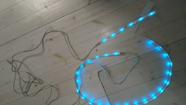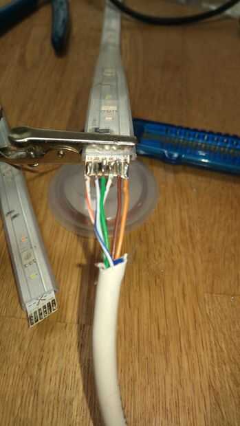 Ya comenté que empecé con la última tira... Era curioso saber si funcionaría, así que primero soldar un cable de red de 3m entre el segmento separado y la tira con los segmentos restantes de 5... Pffffff... funcionaba todavía, mis habilidades de soldaduras fueron confirmados y 70 euros no se perdió!