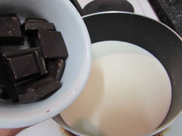 • En una cacerola, calentar la leche y el chocolate oscuro en calor moderado. Cuando el chocolate se derrita y aparecen burbujas en el borde de la cacerola, agregue esto al huevo y harina en un tazón y bate. Cuando se mezcla bien, lo vuelva a colocar la cacerola en fuego moderado, mezclando constantemente con una cuchara de madera hasta que espese.