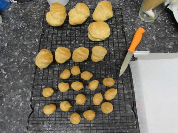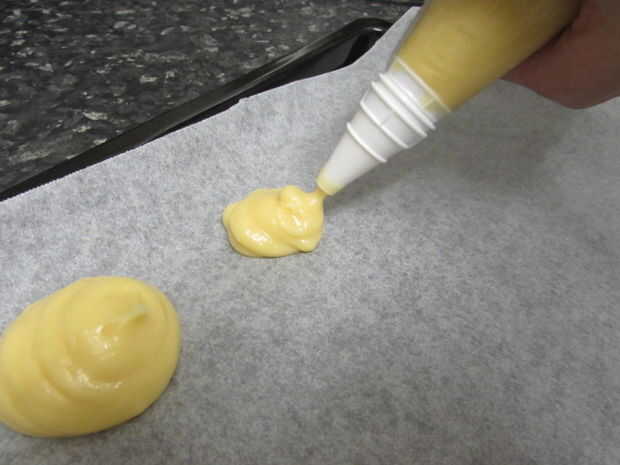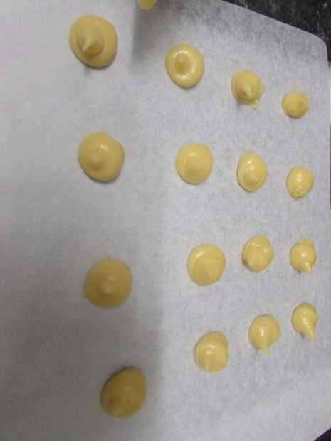 • En una bandeja cubierta de pergamino, tubería de la mezcla usando una punta redonda de 3 tamaños (grandes, medianas, pequeñas). Sólo mina comentar el más grande de tamaño de una pelota golf y el más pequeño uno aproximadamente mármol tamaño. Yo al horno las grandes y medianas en la misma bandeja al mismo tiempo los pequeños soplos en otra bandeja ya que se salen del horno antes.