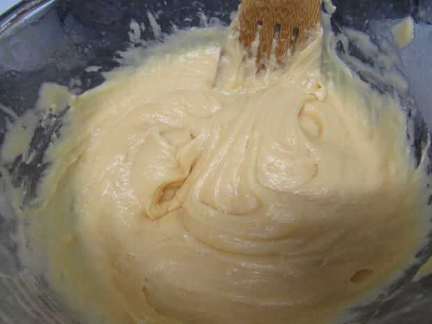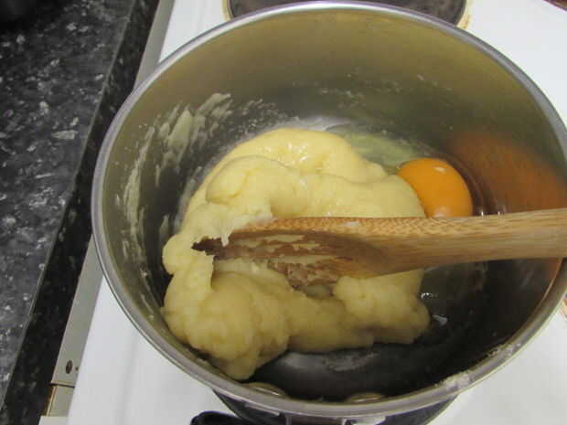 • Agregar un huevo a la vez mezcla la mezcla hasta que el huevo se incorpore antes de añadir otro huevo. Después el cuarto huevo, usted puede ver en la imagen 4 que es brillante y la consistencia es similar a la crema espesa. Deje que esta se enfríe durante 5 minutos.