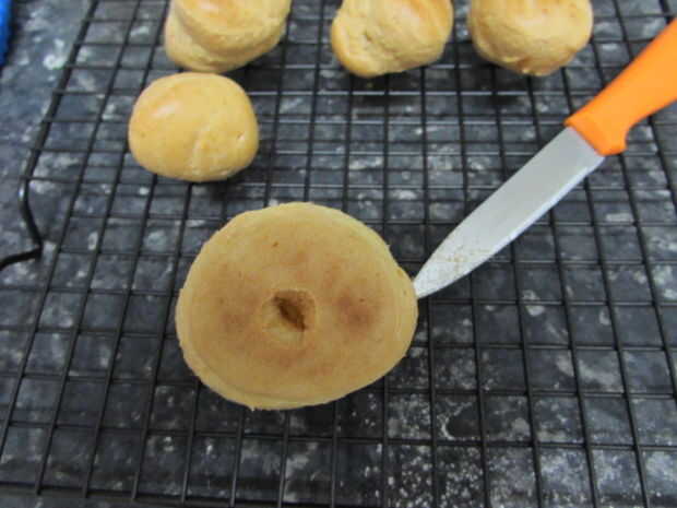 • Una vez retirado del horno, lugar en un cable estante y hacer agujeros debajo de los soplos con un cuchillo pequeño para asegurarse de que la humedad salga.