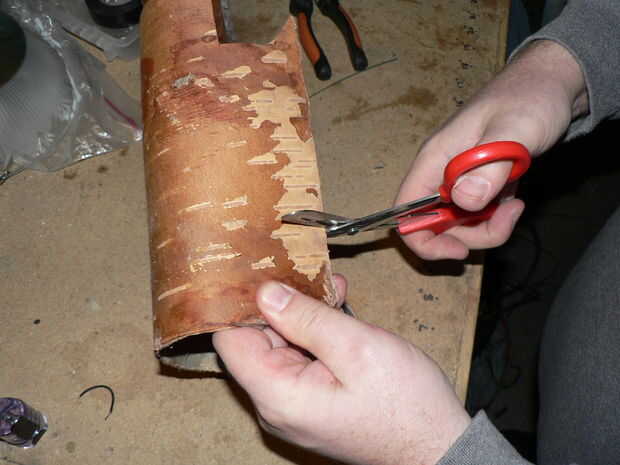Tomando una pieza de tamaño apropiado de la corteza de abedul, recortar la forma que desee. Si te gusta la corteza gris áspera, puede detener aquí, pero la corteza es bastante fácil de separar y exponer el blancuzco (ocasionalmente pink-ish) underbark.