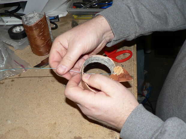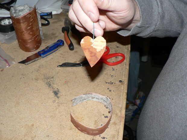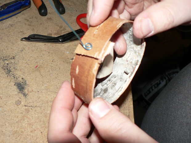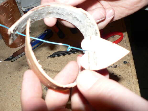 -Empuje que lazo contra la parte superior dentro del círculo, a continuación, (manteniendo la tira de corteza firmemente) doble el cable otra vez contra la parte exterior de la franja de la corteza, para llevar a cabo la tira muy bien en la forma de círculo.
