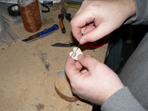 -El cable de alimentación a través de los dos agujeros en la tira de corteza. Juez que debe estar en el círculo y con los dedos doble el cable que forma un bucle ajustado.