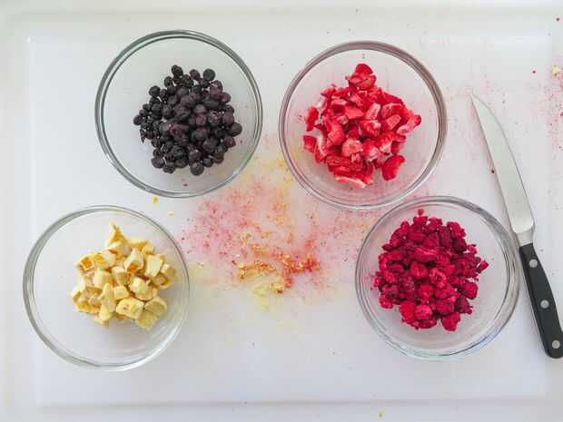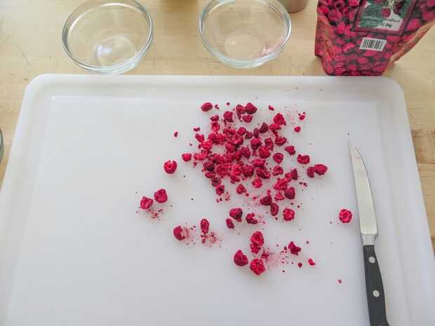 Puesto que la fruta liofilizada, va a ser un poco grumosa. Sólo tenga cuidado cuando se corta, pero siempre puede lanzar las migajas en el chocolate también.