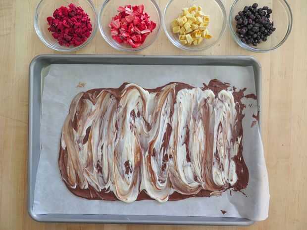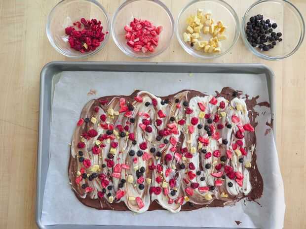 Una vez en el chocolate, salpicar en la fruta. Quiere hacerlo antes de que se endurezca el chocolate. Suavemente empújelo hacia abajo después de que te lo pones por lo que permanece en el chocolate. No dude en poner más fruta que tengo. Sentí que una vez estaba quebrado para arriba en pedazos, no parece tanto.