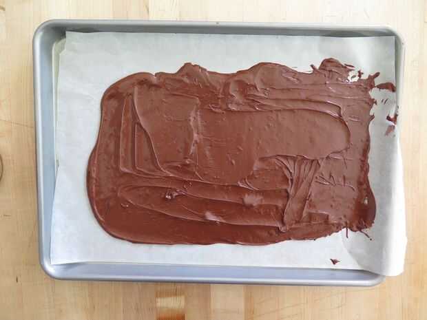 Extender el chocolate sobre el papel de cera por lo que es bastante incluso. No hacerlo demasiado fino o será demasiado débil.