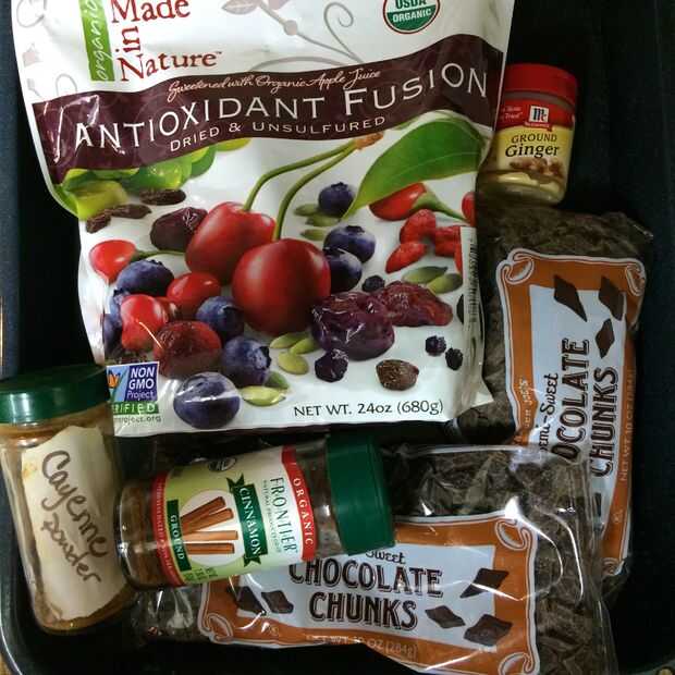 - súper frutas secas 2 tazas - usted puede comprar la marca de Made In Nature™ antioxidante fusión de Costco (arándanos orgánicos, las pasas de uva orgánicas, cerezas orgánicas, semillas de pepita tostada seca orgánica, arándanos orgánicos, las bayas de goji orgánicas), o puede crear su propia mezcla de súper frutas y semillas y tuercas. Un buen lugar para encontrar una gran variedad en bolsitas individuales es de Trader Joe, o tu tienda local salud de alimentos.
