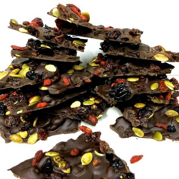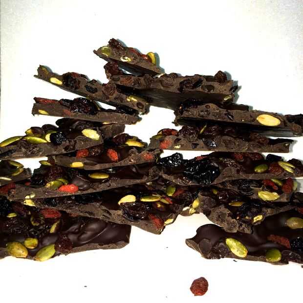 Esta corteza de chocolate deliciosa está atascada lleno de súper frutas llenas de antioxidantes y ricos en minerales pepitas (granos de semilla de calabaza). Es tan estúpidamente fácil de hacer, usted estará haciendo una nueva tanda cada dos horas o así tú y tus amigos pulir cada lote anterior, y ya no mente incluso. Voy a intentar desesperadamente no lamer la espátula revuelva y difundir las bondades del chocolate. ¿Después de todo es toda extensión en el pan? Puede lamer la espátula y el tazón de fuente para el contenido de su corazón de chocolate. Estoy sentada aquí con chocolate en mis mejillas y barbilla. No, no estoy tomando una foto.