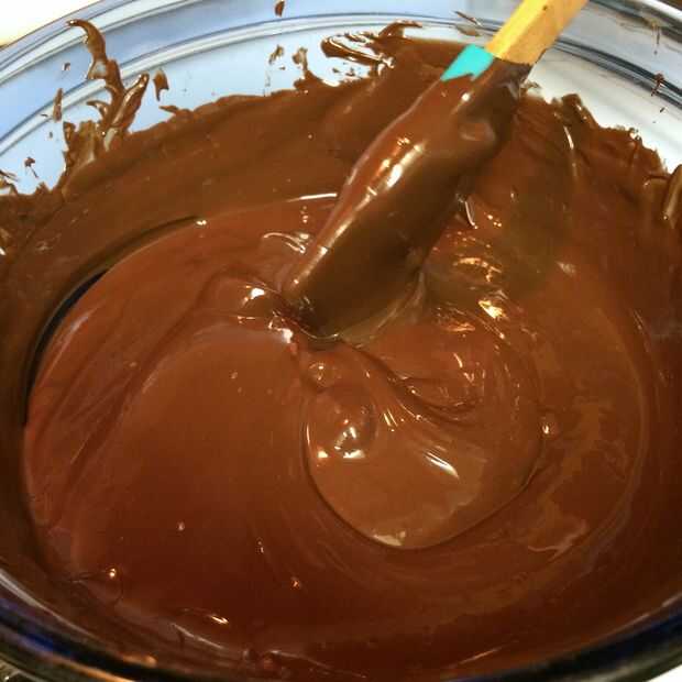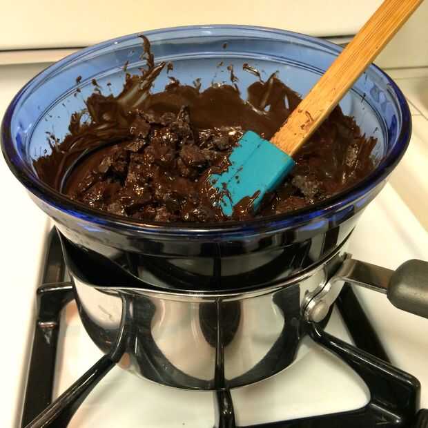 Esto se hace mejor en una caldera doble, o un tazón de vidrio puesto sobre una olla de hervir agua (no hirviendo). Calentar el agua, ajustar la taza en la sartén para que se sienta apenas sobre el agua. Ponga los trozos de chocolate en el bol y revolver hasta que esté suave. Esto debe tomar solamente algunos minutos.