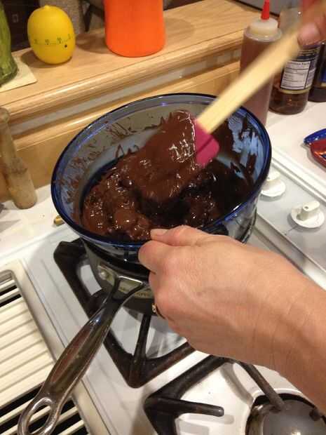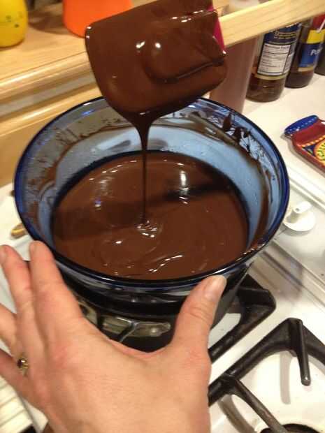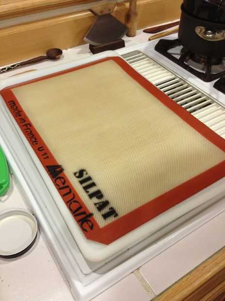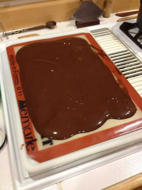 Hervir el agua y derretir el chocolate en un recipiente de Pyrex o baño María en agua hirviendo. Cuando el chocolate es suave, verter sobre su superficie antiadherente, separarse hacia fuera como usted vaya. Enfriará rápidamente, pero cuando está caliente puede ejecutar de los lados. Tenga cuidado de mantener el chocolate dentro de los límites de su papel/silpat como viertes.