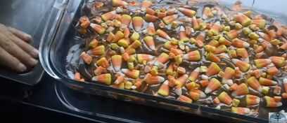 Mientras que el chocolate aún fundido agregar el maíz de caramelo plana en el chocolate. la deje enfriar y endurecer.