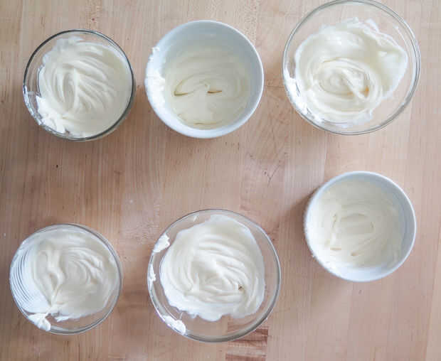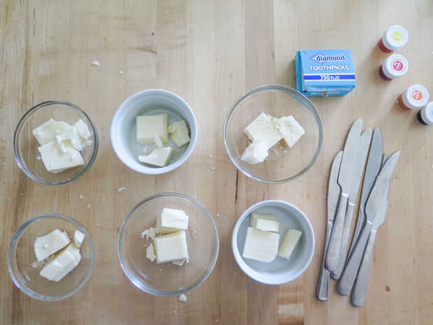 Divida su corteza de almendra o chocolate entre tazones blanco. Debe tener un recipiente para cada color (tenía seis: rojo, naranja, amarillo, verde, azul y púrpura). Si utiliza corteza de almendra, ya se divide en cubos de prácticos y se pueden utilizar dos cubos por color.