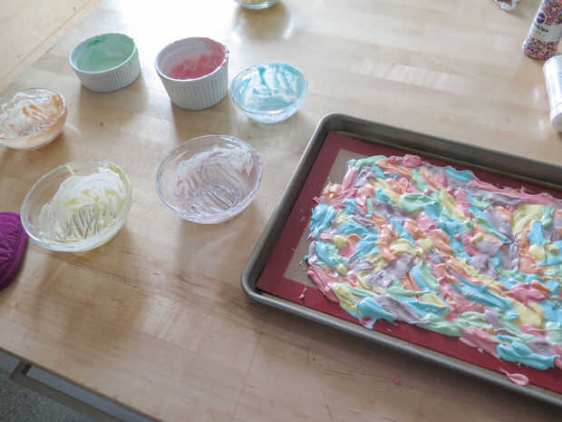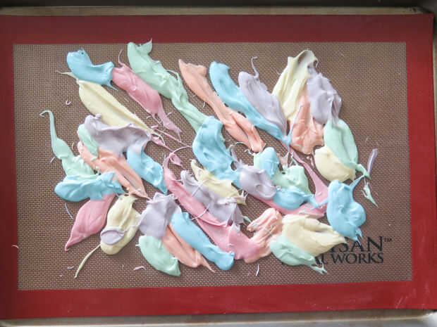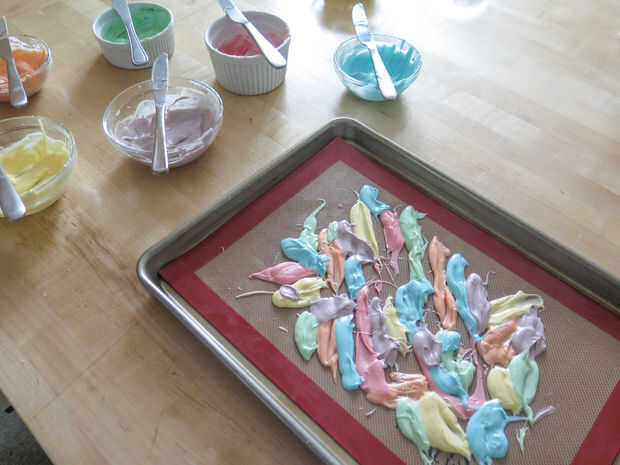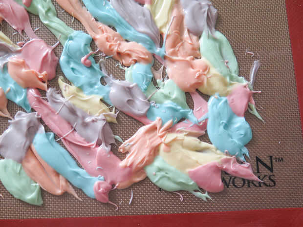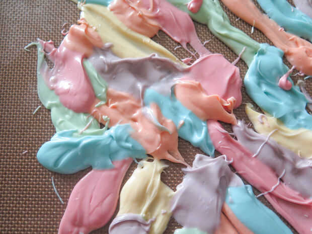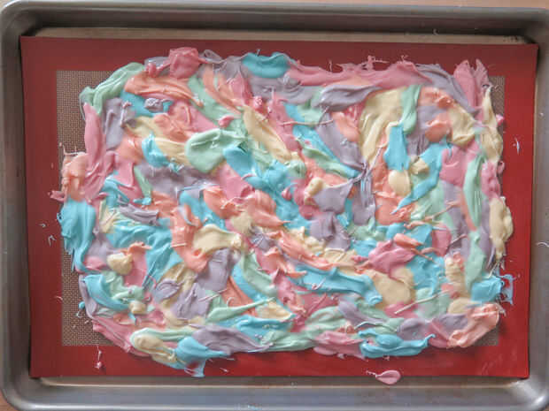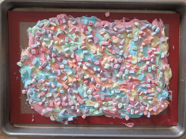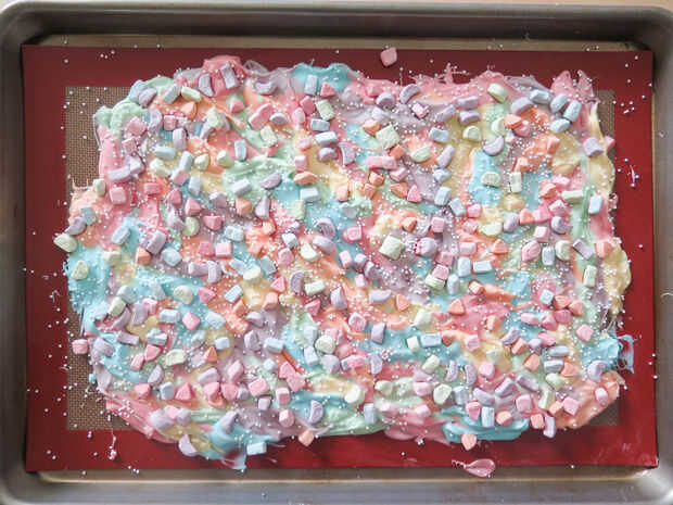 Una vez que tengas todos los colores hacia abajo, es hora de decorar. Como he mencionado en el paso de suministros, remata mi corteza con cereales malvaviscos y chispitas blancas. En mi opinión, realmente no puede Agregar demasiados bombones porque son sabrosas y algunas de ellas se rompen cuando usted rompe la corteza, por lo que es mejor tener más que demasiado poco. Creo que cada bocado de la corteza debe tener 1-3 malvaviscos en él para delicadezas.