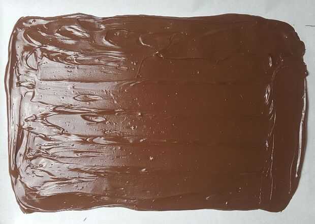 Línea de la parte inferior de una hoja para hornear o bandeja con papel sulfurizado y verter el chocolate derretido en la bandeja para hornear preparada, extendiendo con una espátula offset en una fina capa suave. Coloque la bandeja para hornear o bandeja en el refrigerador durante 10-15 minutos o el congelador durante unos 8 minutos; o hasta que esté casi completamente establecido.