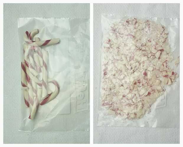 Colocar los bastones de caramelo en una bolsa ziplock selladas y el rodillo con el rodillo hasta que queden.