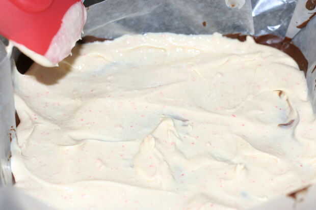 Intente verter sobre en una capa lisa para minimizar la cantidad de la necesaria con la espátula. No quiero perturbar la capa de chocolate oscuro - descremada solo el chocolate blanco encima de él.