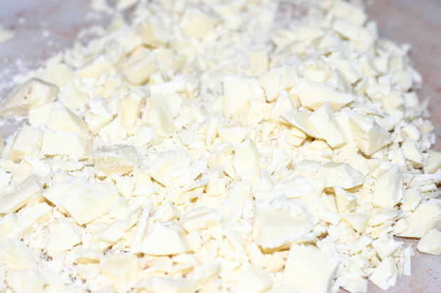Cuando la capa de chocolate oscurezca haya espesado pero es todavía un poco pegajosa al tacto, suavemente Vierta el chocolate blanco y luego alisar con una espátula resistente al calor.