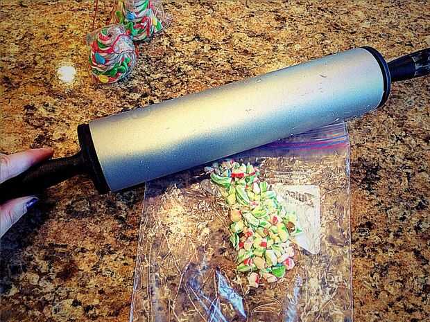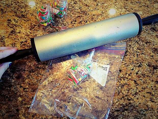 Empezar recogiendo todos los bastones de caramelo sobrante que desea utilizar y que son con sabor a menta. Sacar los bastones de caramelo de sus envolturas y luego colocarlos en una bolsa de vacío ziplock. Cierre el ziplock detrás y usar el rodillo para aplastar a los bastones de caramelo en trozos pequeños.