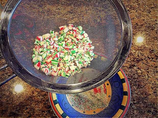 Vierta los bastones de caramelo triturado en un tamiz y golpee levemente para quitar los trozos finamente picados.