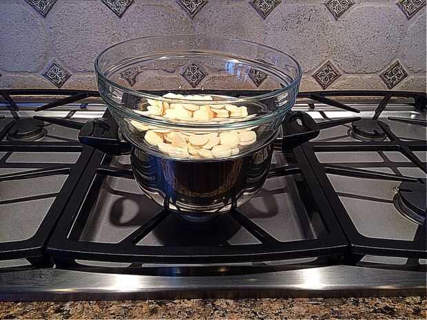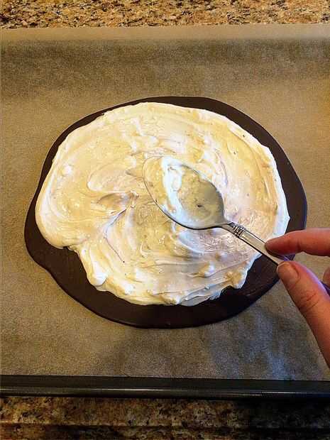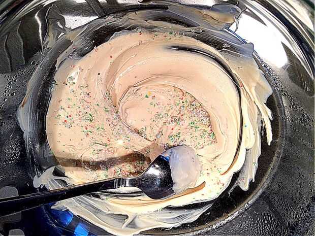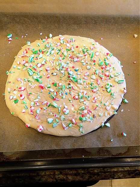Tomar algunos de los bastones de caramelo finamente triturado que tamizado hacia fuera antes y lo coloca en la mezcla de chocolate blanco - dándole un poco de color.