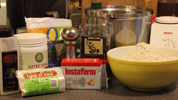 Colocar todos los ingredientes en la taza del Bosch excepto mitad harina de trigo integral, gluten y la levadura. Usando su combinación de gancho de masa baja. Añadir el resto de la harina de trigo integral, levadura y harina de gluten hasta que tienes un poco de una masa pegajosa pero tira limpia de los lados del tazón de fuente. Cambiar a 2 al agregar la última de la harina. Cambie a 1 y amase unos 8 minutos ayudar a desarrollar el gluten. Dividir la masa en bolas de 5. Después de rodar hacia fuera cuatro utilicé una bola para hacer las cuatro mini pizzas.