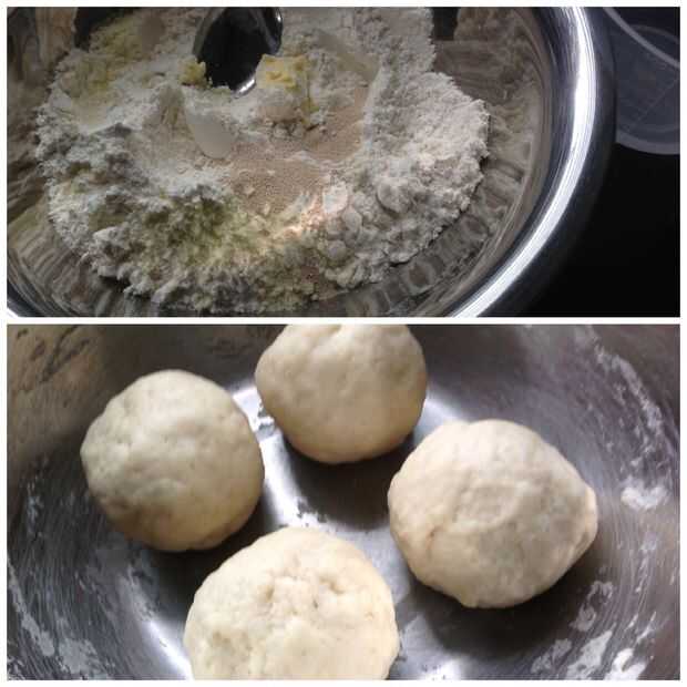 La masa entera puede conseguir 1 tamaño de la pizza grande. Desde que tengo horno pequeño, me divide la masa en 4 y cada uno en una bola de la forma. El tamaño es tamaño pizza personal.