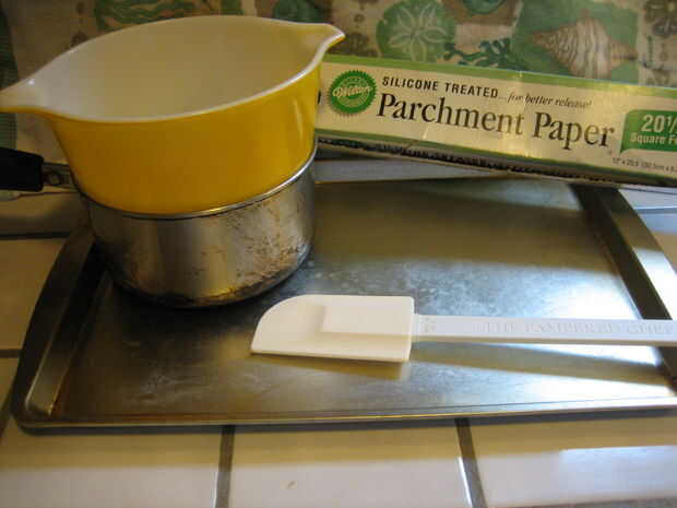 Necesitarás una bandeja para hornear, papel pergamino, una espátula, cacerola de fritada y una caldera doble o algunas fuentes de horno colocaron sobre una olla hirviendo.