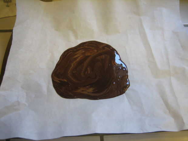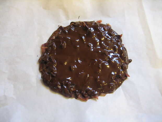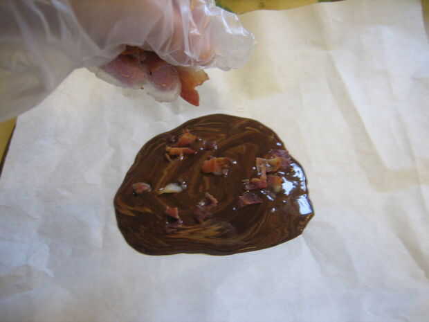 Desmenuce el tocino todo el chocolate y verter el resto de la mezcla en la parte superior, que se separa ligeramente con una espátula.