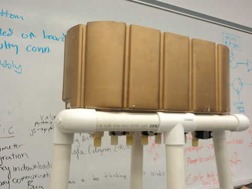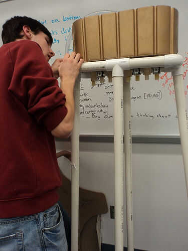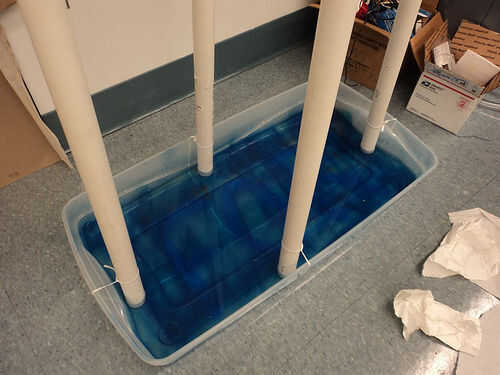 Las patas de la estructura fueron aseguradas en el depósito inferior con elástico estirado debajo de la bañera para sujetar firmemente las piernas contra los lados de la bañera.