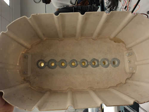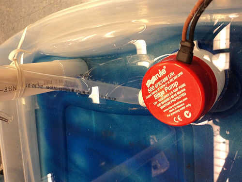 Independientemente del método que se utilizó, la parte inferior de la cuenca era demasiado fina para nada y fijarse a él, así nos jodidos una hoja gruesa de 1.5" de plástico con los agujeros previamente trabajados a máquina para las válvulas, en la parte inferior de la cuenca. El plástico que utilizamos era similar al corte tipo tableros se hacen de, pero hará cualquier lámina de plástico, siempre y cuando sea lo suficientemente gruesa. Después de eso, había pegado las válvulas y sellaron el área alrededor de la tubería y tornillos dentro de la cuenca. Seleccionar el sellador adecuado es crucial-probamos masilla epoxi pero todavía dejó grietas poco. Estamos seguros de que hay otros epóxicos o adhesivos a base de silicio que funcionarían, pero terminamos haciendo con pegamento caliente.