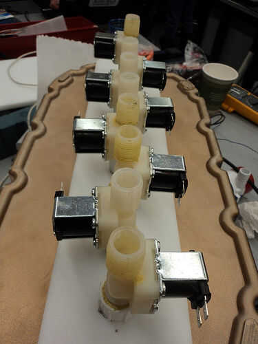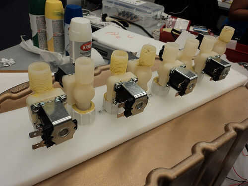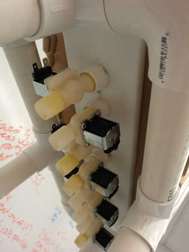 Utilizamos válvulas de solenoide para crear la cascada, ya que puede ser conectados a un microcontrolador que da señales para que puedan abrir y cerrar. Mientras que la mayoría de las válvulas solenoide es muy caros ($50-90), hemos sido capaces de conseguir más barato, $16 válvulas de la tienda de ebay valves4projects. Se utilizó una gravedad válvula en lugar de una válvula a presión porque era más fácil tener una cuenca abierta de agua de un sistema a presión cerrado. Mientras que las válvulas de alimentación por gravedad sólo puede tolerar 7 pies de agua por encima de ellos, nosotros no tenga algún problema con eso.
