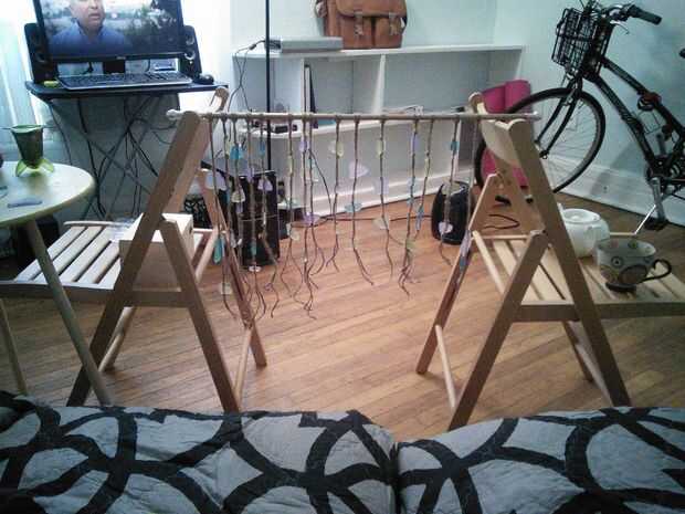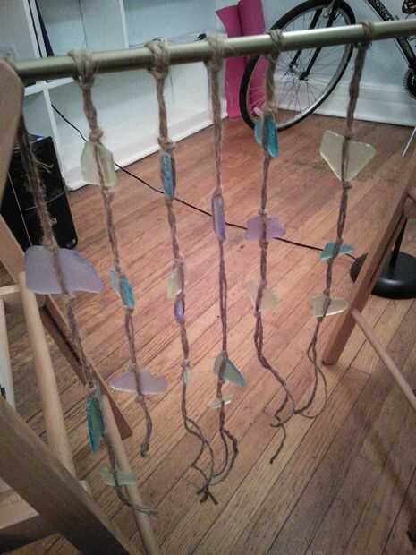 (3) empezar a atar nudos. Más apretado, mejor. Mi estrategia era nudo superior, coge la pieza de vidrio en el lugar y el segundo nudo para que el espacio entre los dos nudos un poco más pequeños que el vidrio. Yo entonces mueva el cristal en su lugar, mantener todo lo mas ajustado posible.