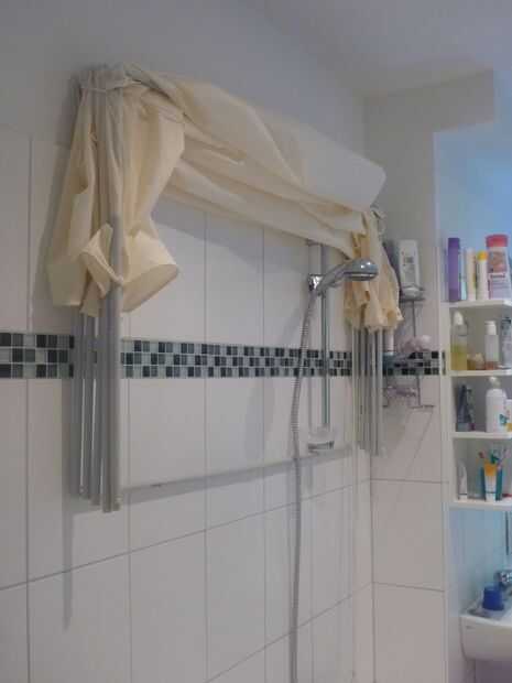 Los problemas son por ahora con la tortuga mojado! Para menos de 20 euros puedes construir uno en una hora o así. Puede ser doblado en un segundo. Fuera del camino, es higiénico y suficiente espacio para dos personas a la ducha. No hay cortinas de baño pegajoso, puede (re) uso su cortina de ducha actual sin ajustes.