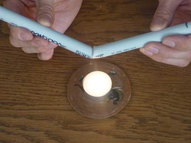 Doblar los tubos de PVC girando lentamente ±5cm tubo sobre la llama de una vela. Nuevamente, tenga cuidado de no quemarlo. Cuando es suave doblar 90 grados y espere un minuto hasta que esté duro otra vez.