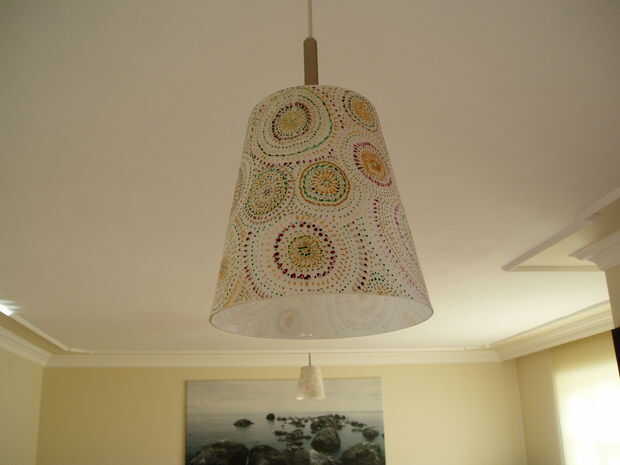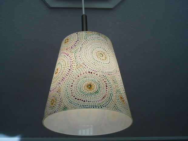 Dos de la basisk tenemos lámparas colgantes para nuestro salón pero sólo se veían un poco bla. Como son vidrio, he recordado mis pinturas de vidrio y se puso a trabajar. El diseño fue basado en algo de interconexión círculos de tela. Quería una fresca, mirada de estilo indio que recuerdan patrones de paisley de sari pero quería mantener los círculos, así puntos outliner y utiliza un pincel fino para crear el patrón de uso de pinturas de vidrio estándar.