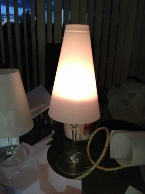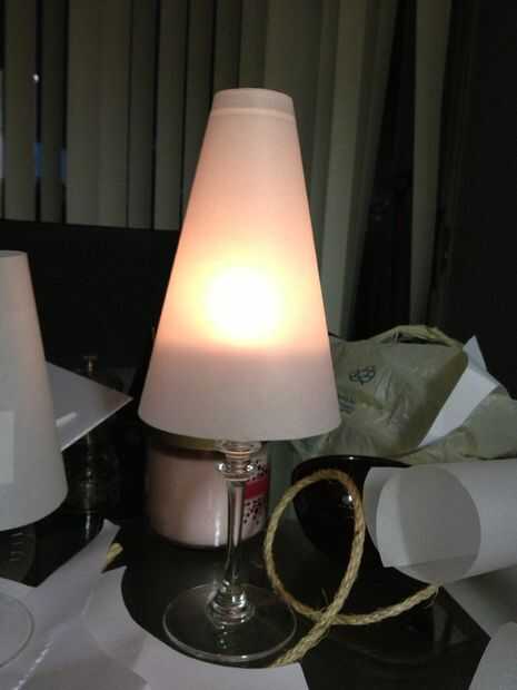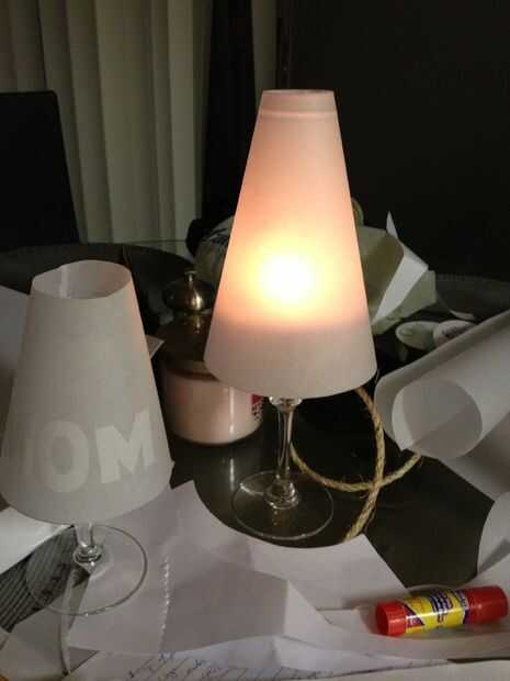 Después de que el pegamento se seca, deslice una luz en el vidrio de vino del té y deslice la sombra sobre la Copa de vino.
